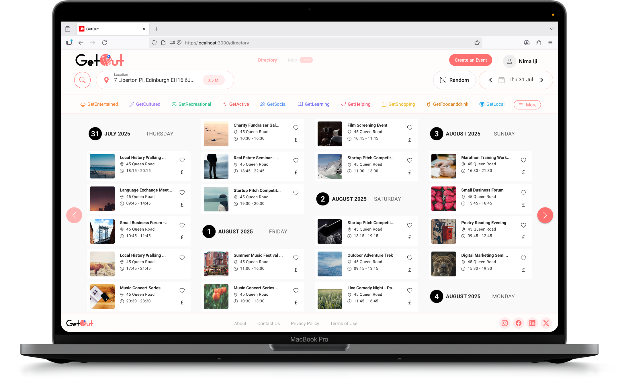 Whether it’s a weekly yoga class, a pub screening the football, a village fête organised by the council, or a rising artist’s first tour — every event should be easy to find. GetOut is the central platform that empowers hosts of all kinds to promote their events directly to the people searching for them — for free.